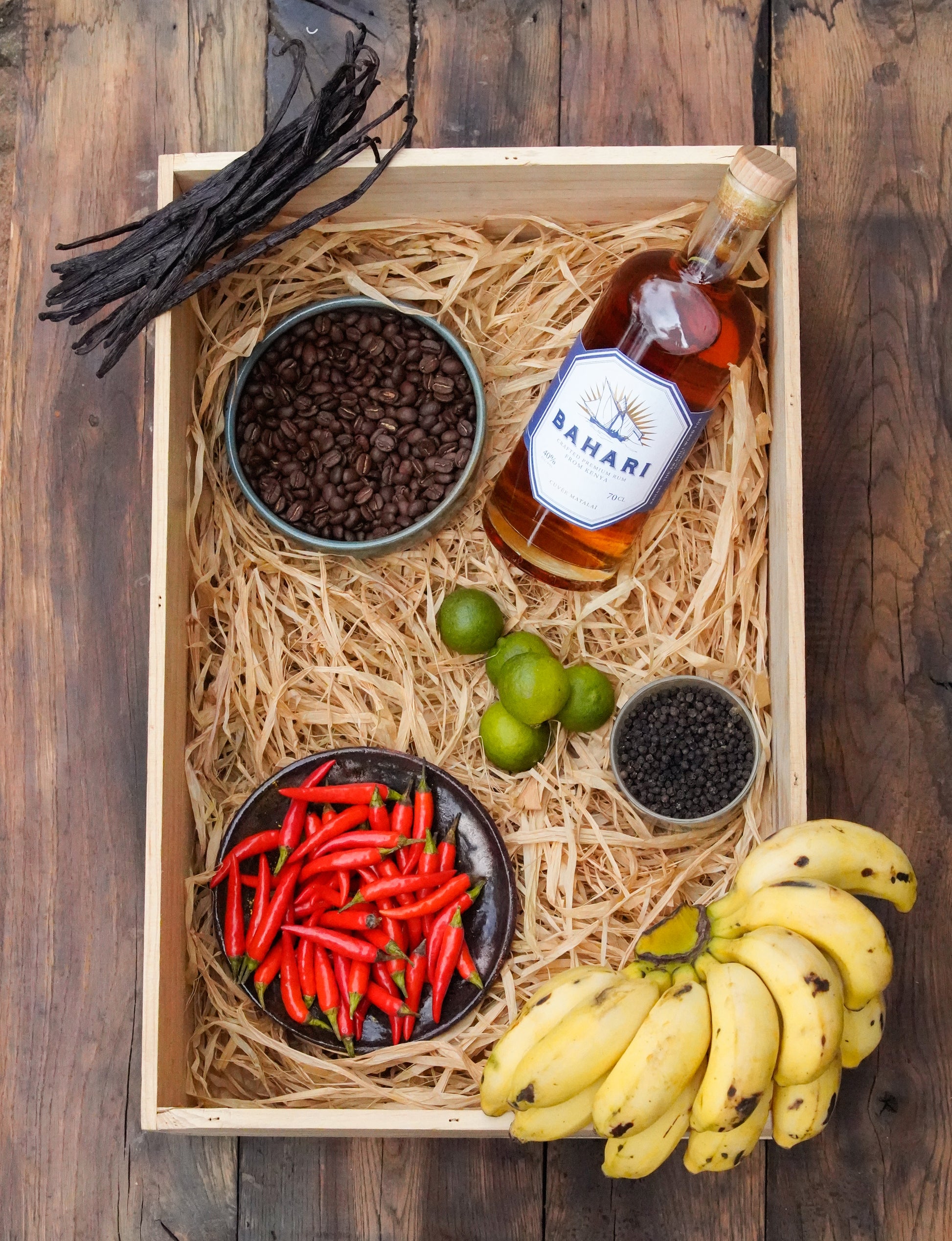 Bahari, le mot swahili pour océan. Le rhum Bahari puise ses racines dans les terres anciennes et les eaux tropicales orientales de l'océan Indien, autrefois traversées par des boutres traditionnels transportant épices et richesses. C'est un mélange délicat de mélasse kenyane et de vieux rhum vieilli en fût de chêne américain avec des notes distinctives de vanille Bourbon et de bananes cuites lentement. Bahari Rum, le premier rhum premium d'Afrique de l'Est, est distillé vieilli et mis en bouteille au Kenya.
