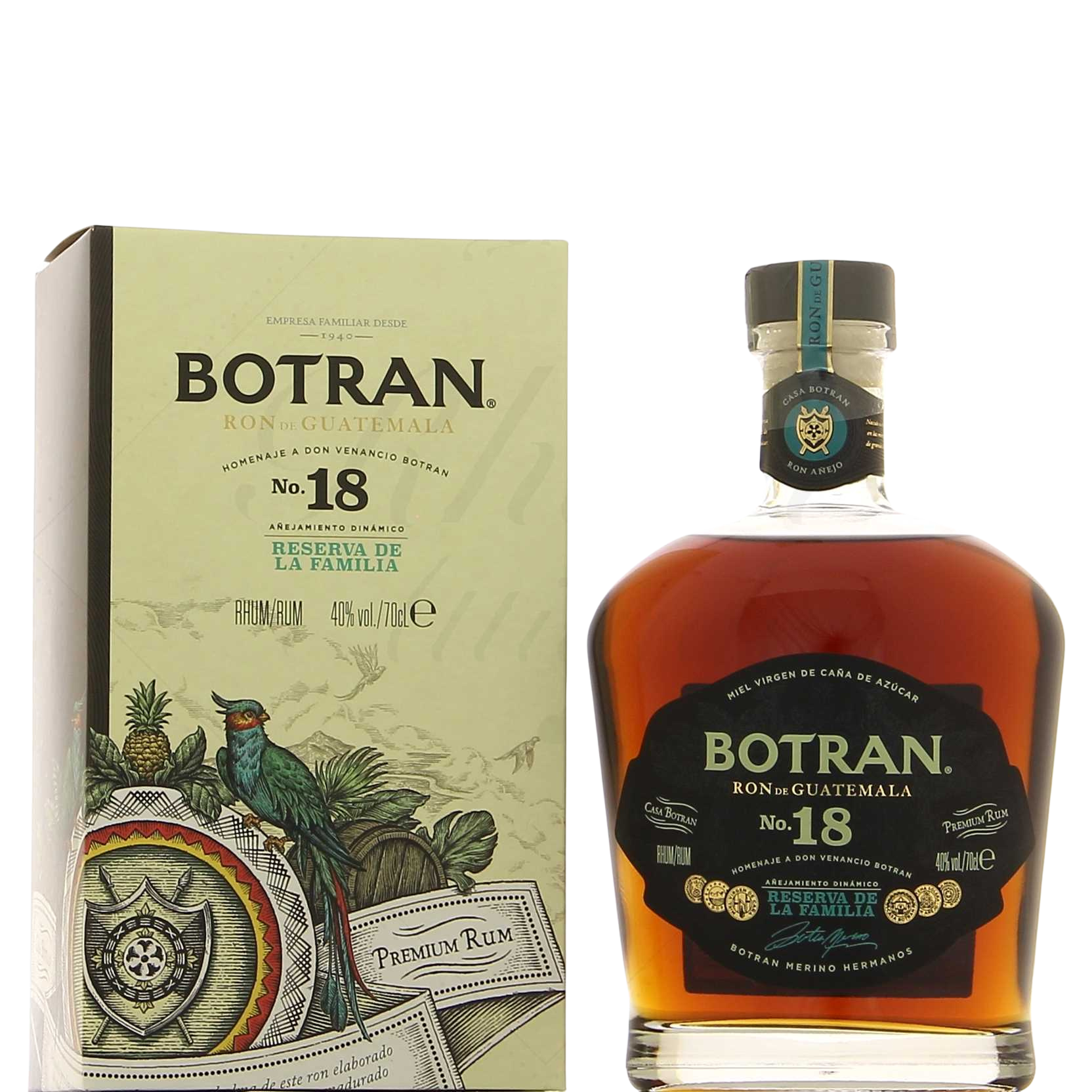 Botran 18 est un rhum prestigieux qui a acquis son caractère et sa maturité sur les hautes terres fertiles et tempérées du Guatemala. Assemblé à partir de plusieurs rhums âgés de 5 à 18 ans en système solera, sa complexité provient également des différents types de fûts utilisés pour sa maturation : les tonneaux de chêne américain ont en effet auparavant contenu du vin de xérès et du porto.
