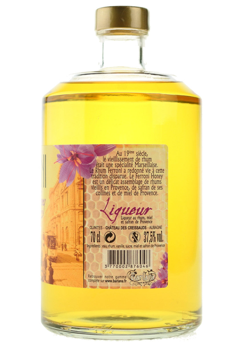 Ferroni Honey Rum est un mariage subtil entre du miel de lavande IGP Provence, du safran produit aux portes de Marseille (du vrai à 30 000 €/kg…), et bien sûr du rhum ambré (même blend que celui qui a servi à faire le Rosé Rhum Blend, mais sans l’élevage en fût de Rasteau, donc 1 an de vieillissement en fût de Cognac).