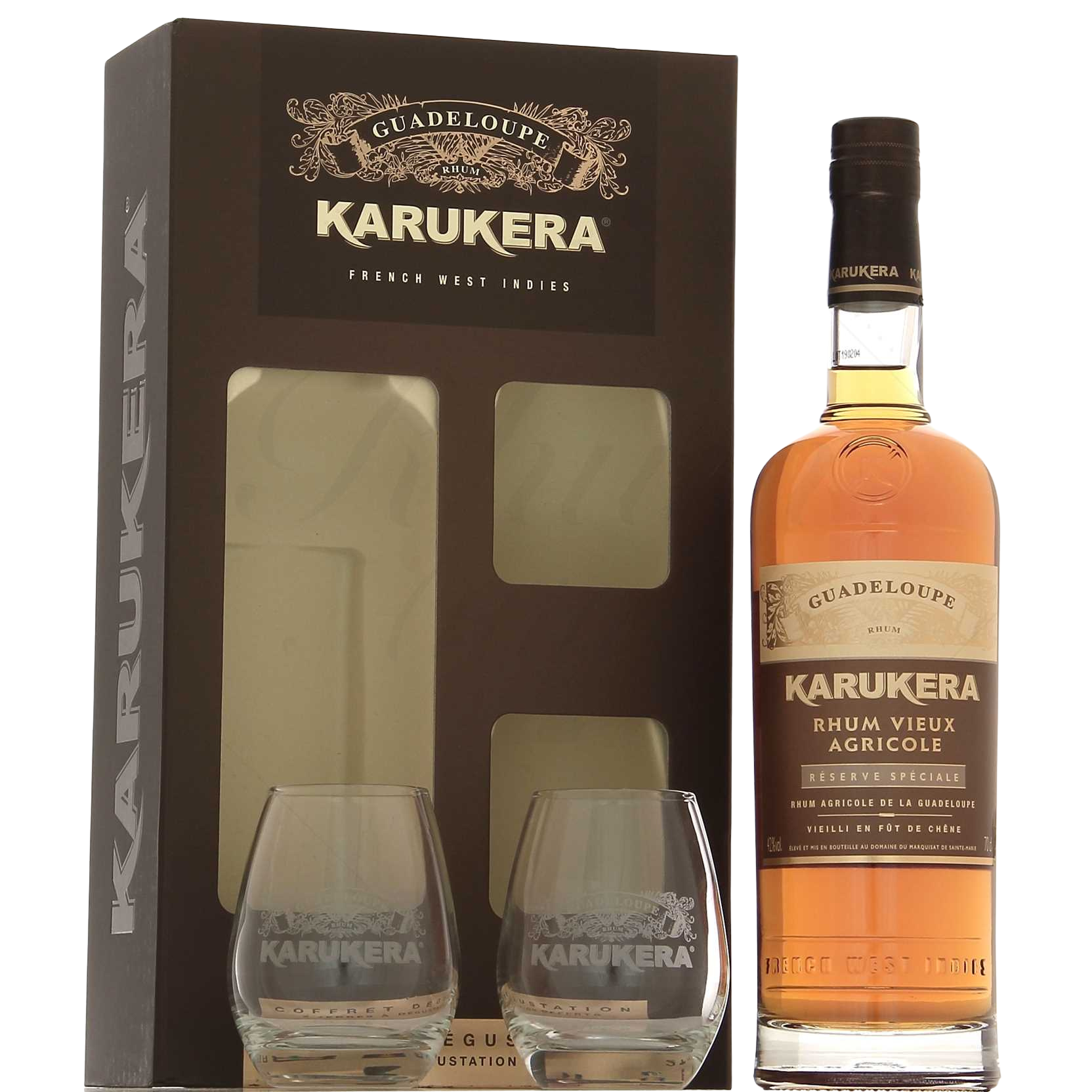 Karukera Réserve Spéciale est ici accompagné de 2 verres sérigraphiés. Pour les inconditionnels de ce rhum vieux et délicat de Guadeloupe !