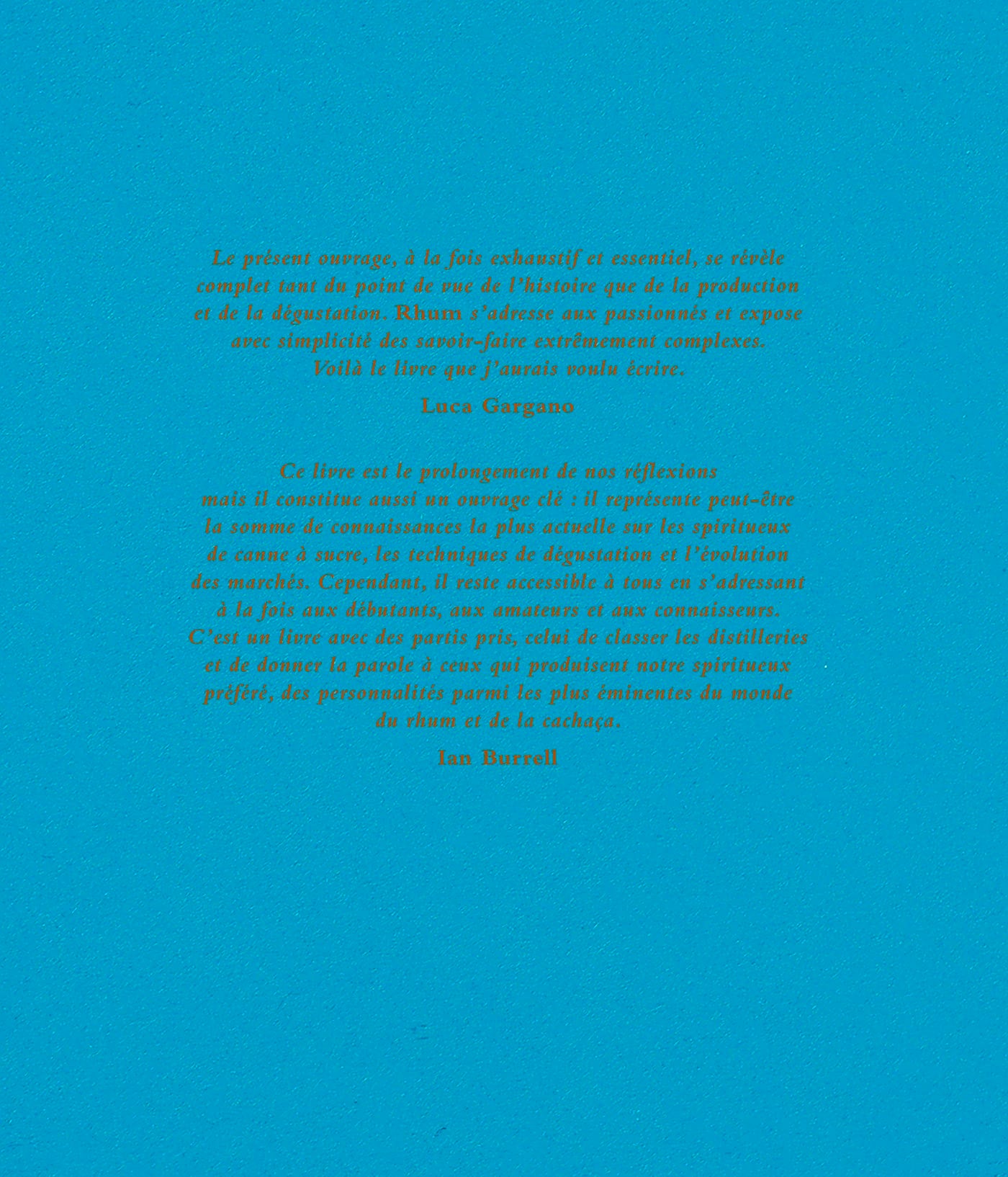 "Ce livre est un prolongement de nos réflexions mais il constitue aussi un ouvrage clé : il représente peut-être la somme de connaissances la plus actuelle sur les spiritueux de canne à sucre, les techniques de dégustation et l'évolution des marchés. Cependant, il reste accessible à tous en s'adressant à la fois aux débutants, aux amateurs et aux connaisseurs. C'est un livre avec des partis pris, celui de classer les distilleries et de donner la parole à ceux qui produisent notre spiritueux préféré, des personnalités parmi les plus éminentes du monde du rhum et de la cachaça."
